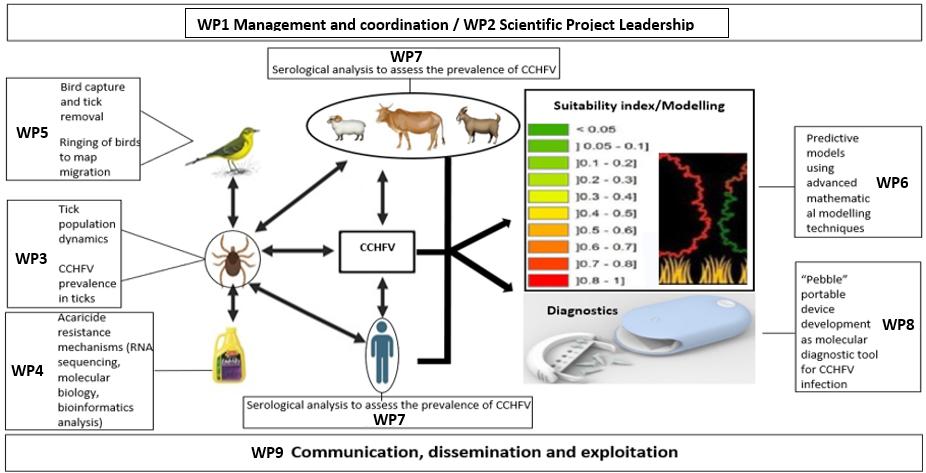 Objectives: To conduct serological analysis on cattle, sheep and goats (300 animals per year) to assess exposure to CCHFV. Measure antibody titres and investigate cross-species transmission dynamics. Sampling areas will align with those used for ticks, with sera collected from animals only when found to be infested with ticks. Additionally, WP7 encompasses studies of CCHFV exposure in 2000 humans per year, focusing on high-risk areas defined by the literature at the beginning of the project and the mathematical models developed by WP6 as the project progresses.